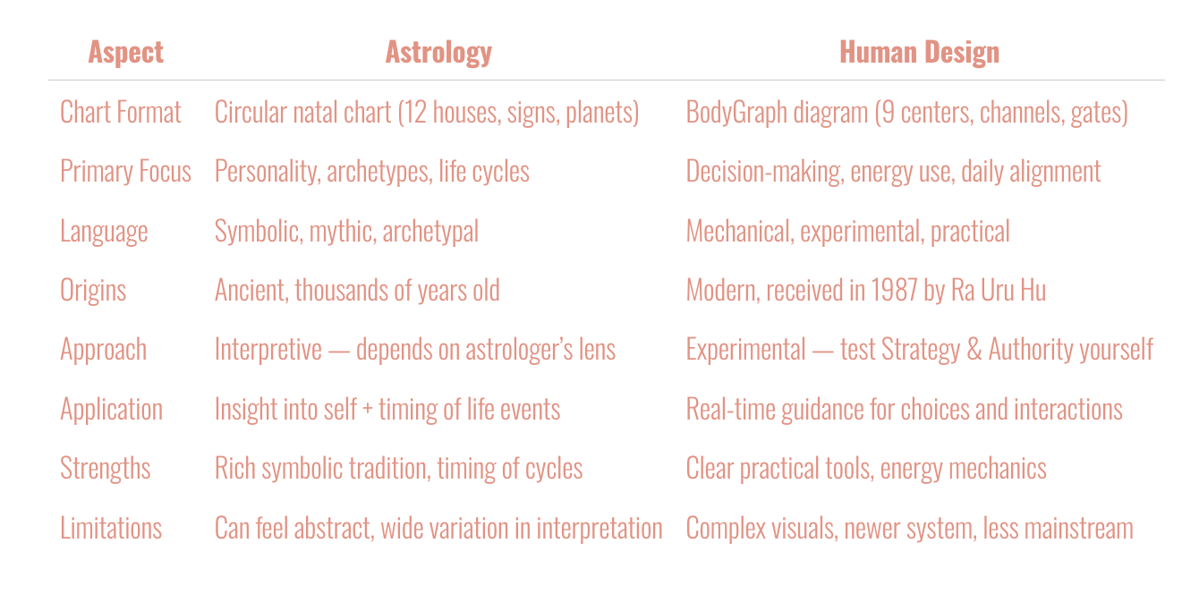 Astrology leans on myth and metaphor. Its strength lies in story. Human Design uses the language of design and mechanics - it’s more about experimenting than believing. If astrology says “Here’s the archetype you embody,” Human Design says, “Here’s the strategy to try.”